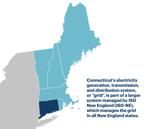 Connecticut’s electricity generation, transmission, and distribution system, or “grid”, is part of a larger system managed by ISO New England (ISO-NE), which manages the grid in all New England states. The utilities in Connecticut at the state level are regulated by the Public Utilities Regulatory Authority (PURA) as well as the Department of Energy & Environmental Protection (DEEP). Federally, they are overseen by the Federal Energy Regulatory Commission (FERC) and the North American Electric Reliability Corporation (NERC), and at a regional level by the Northeast Power Coordinating Council (NPCC), who work with NERC. NPCC works directly with utilities and other stakeholders in collaborative meetings throughout the year.