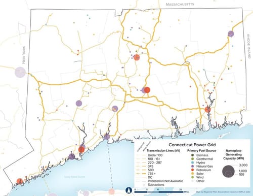 New England generates most of its own power, but also purchases power from Canada and New York. Connecticut, however, is a net exporter of power - meaning it produces enough energy to meet its own demand and transmit additional power into the larger grid - with a mix of energy sources. In 2023, natural gas accounted for 60% of Connecticut’s total electricity generation, with nuclear accounting for 33% and 6% from non-hydroelectric renewable sources. The last coal power plant in the state was retired in 2021. Generating units are owned by a variety of entities, including municipalities, dedicated energy generation companies, Universities, nationwide utility companies, and investors.